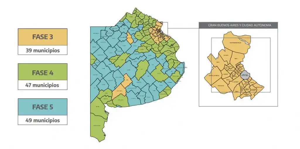 De acuerdo con la disposición del gobierno provincial, los 49 municipios restantes del interior bonaerense se encuentran en fase 5: son aquellos que en las últimas dos semanas hayan tenido “diez o menos de diez nuevos casos de Covid-19 por semana, cada cien mil habitantes y no pertenezcan al AMBA”.