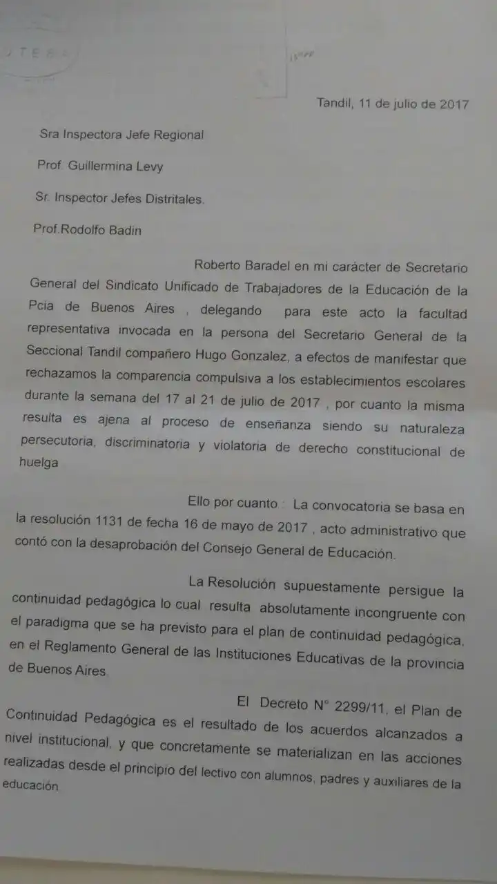 De esta forma, se remarcó que se tuvo que recurrir a dicha instancia “ante la ilegítima y compulsiva convocatoria de la Dirección General de Cultura y Educación a trabajar durante el receso invernal” como mecanismo para el recupero de días de clases perdidos por paros.