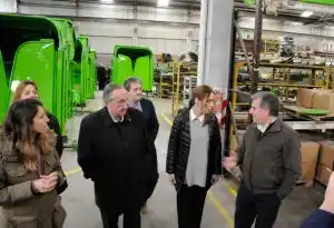 Finalizada la recorrida por la fábrica del Parque Industrial, la transmisión oficial del Gobierno bonaerense incluyó una breve exposición de la Gobernadora y del intendente Miguel Lunghi, acompañados por el titular de la firma, Carlos Martínez y los trabajadores.