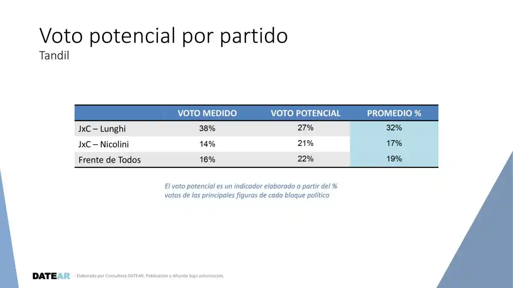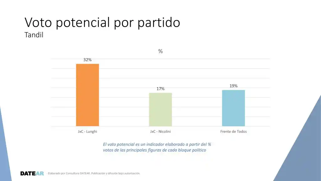 Un dato llamativo se observó entre el grupo de los 26 a 38 años, donde el 27 por ciento optaría por otra lista; el 29 por ciento apoyaría a Lunghi; el 17 por ciento a Nicolini y el mismo porcentaje al Frente de Todos.