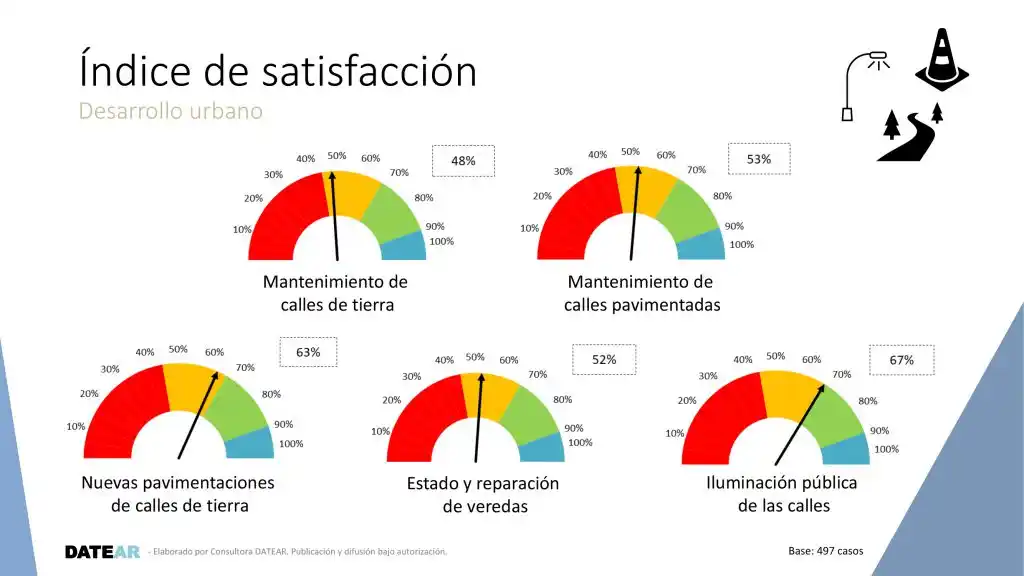 El trabajo de DateAR también se enfocó en el estudio del índice de satisfacción con el Gobierno local, a través de distintos indicadores vinculados a los servicios urbanos, problemáticas recurrentes y a la planificación de la ciudad.
