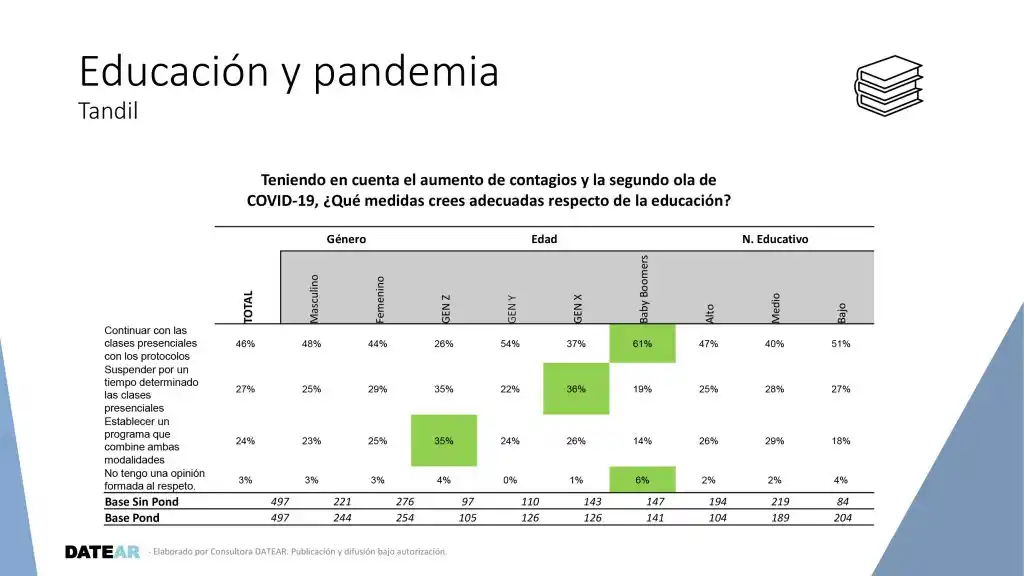 Asociado al contexto de la pandemia, una sección del sondeo se enfocó a relevar la opinión de los tandilenses respecto a la educación. En este aspecto, la consulta puntual versó sobre los medios adecuados para la enseñanza-aprendizaje formal, teniendo en cuenta el aumento de los contagios y la segunda ola del Covid-19.