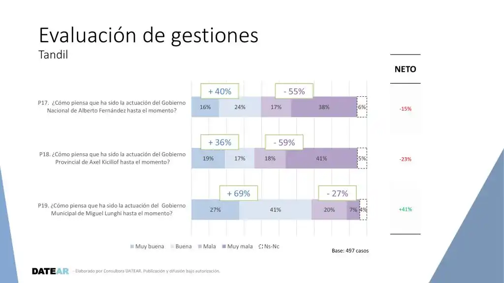 Del análisis de los porcentajes surge que el grupo que más aprueba la gestión de Miguel Lunghi, es decir el de mayores de 56 años (definido como Baby Boomers) que en un 80 por ciento afirmó que es buena o muy buena, es el que menos coincide con las actuaciones de Kicillof (68 por ciento dice que es muy mala o mala) y de Alberto Fernández (65 por ciento pronunció que es mala o muy mala).