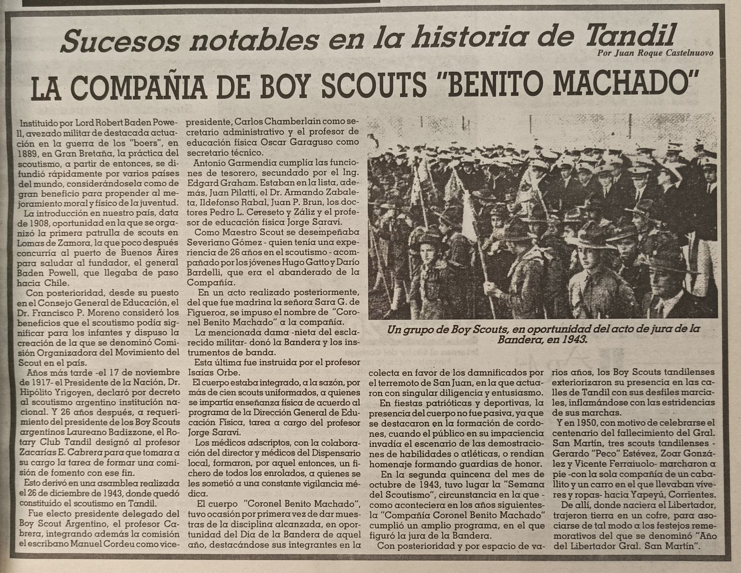 En la segunda quincena del mes de octubre de 1943, tuvo lugar la "Semana del Scoutismo", circunstancia en la que como aconteciera en los años siguientes la "Compañía Coronel Benito Machado" cumplió un amplio programa, en el que figuró la jura de la Bandera.